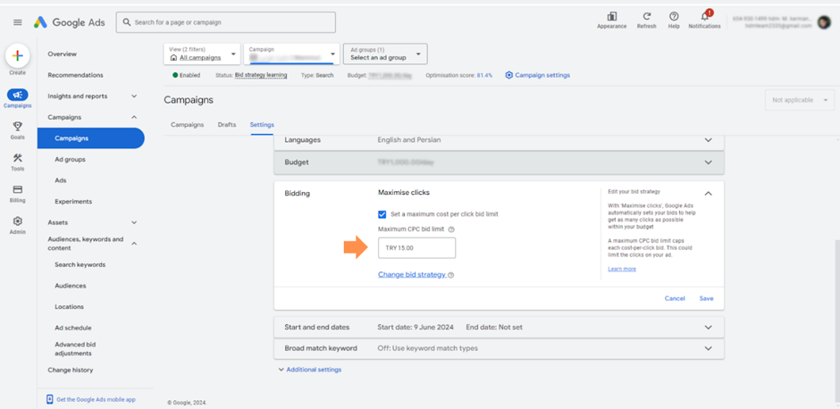 If your bid is set too low, your campaign may receive very few impressions—or in some cases, no impressions at all. If the campaign is using the Maximize Clicks bidding strategy, simply go to the Settings section at the campaign level and click on Bidding to review or adjust your bid limit.