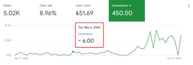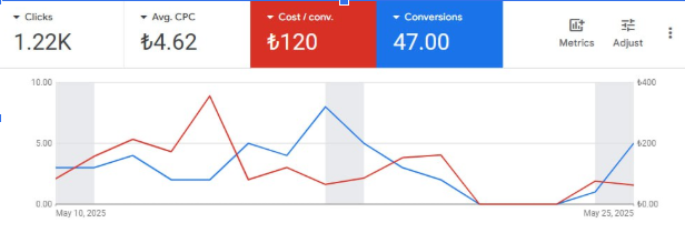- Cost per conversion dropped from around ₺350 to ₺15–₺17