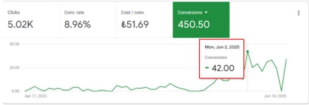 During the comparison period:- Daily conversions increased from 4–6 to peaks of 42